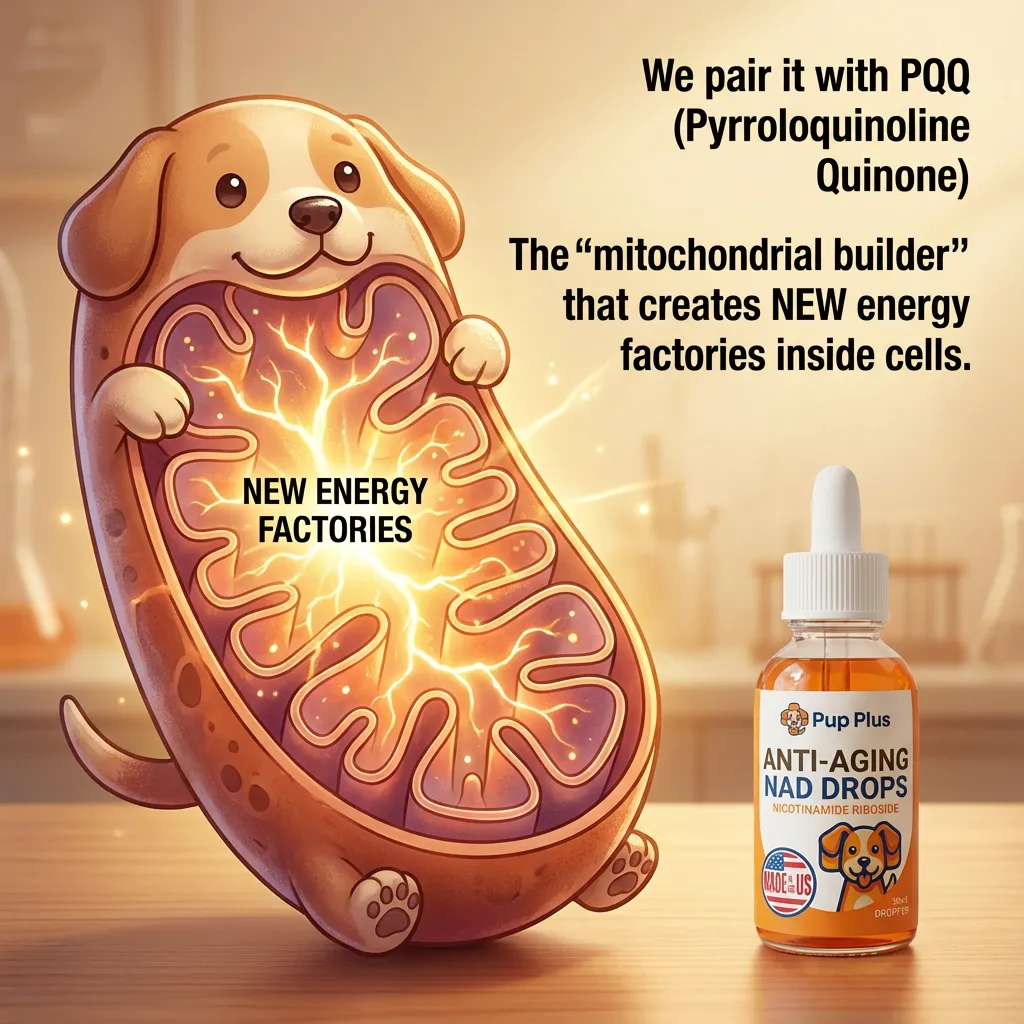 Give your dog 2-4 extra healthy years with Pup Plus™—powered by the CanineNAD+ Renew™ Complex: pharmaceutical-grade Nicotinamide Riboside (NAD+ precursor) + PQQ (mitochondrial builder) + CoQ10 (organ protector). Slow cellular aging, restore energy, and help your dog feel years younger—backed by our 180-Day Tail-Wag Promise.