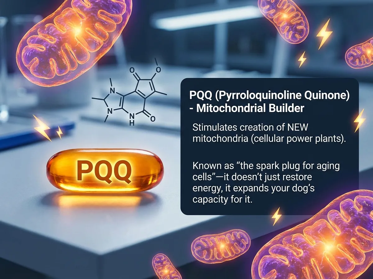 Stimulates creation of NEW mitochondria (cellular power plants). Known as "the spark plug for aging cells"—it doesn't just restore energy, it expands your dog's capacity for it.