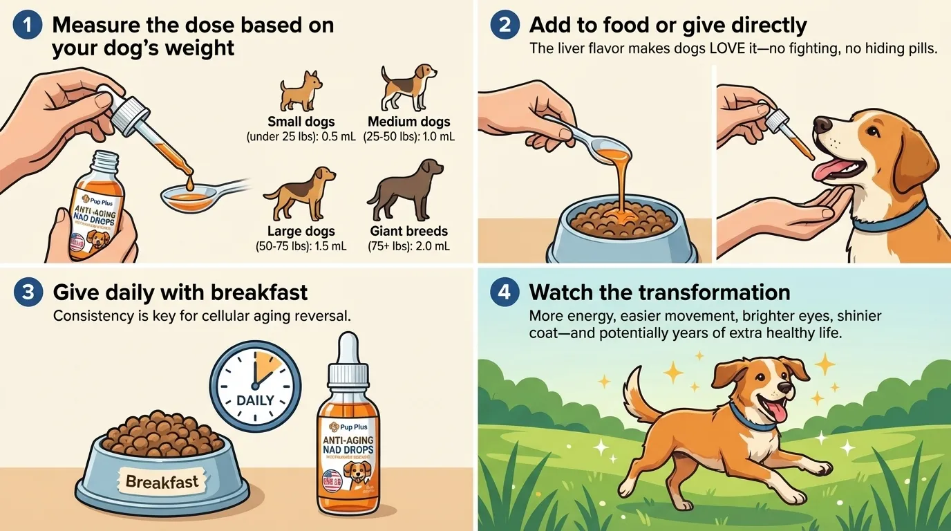 Get excited. Energy levels noticeably increase. Stairs are easier. Walks last longer. Eyes look brighter. Coat starts getting shinier. You're seeing the first visible signs of cellular rejuvenation.